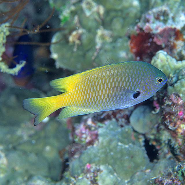 ニセモンツキスズメダイ (スズメダイ科) Pomacentrus nigromarginatus Allen, 1973 [Pomacentridae]