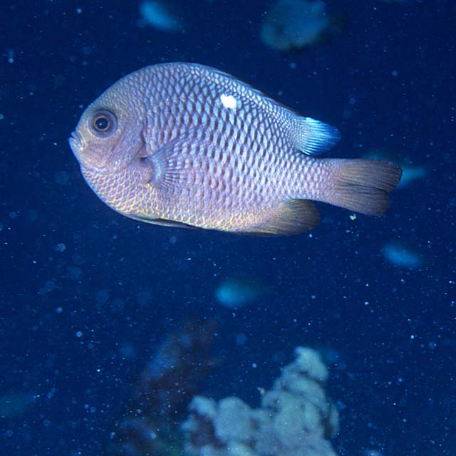 ミツボシクロスズメダイ (スズメダイ科) Dascyllus trimaculatus (Ruppell, 1829) [Pomacentridae]